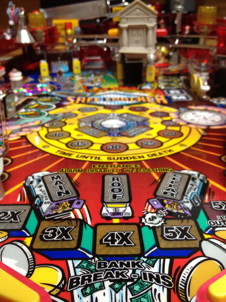 The object of SC is to play the pinball portion of the game and then break into the bank to play the board game which gives the player an opportunity to win a token. The pinball part of the game awards the player with items that will help the players journey around the board game. The play is timed so the number of balls is not set to 3-5 but will be determined by how long balls stay in play. A player could play an entire game on one ball or as many as was used while the clock still had time on it. This makes it for a bit of a tricky multiplayer game for the uninitiated but once people become more familiar with the ruleset it becomes a favorite in my lineup.